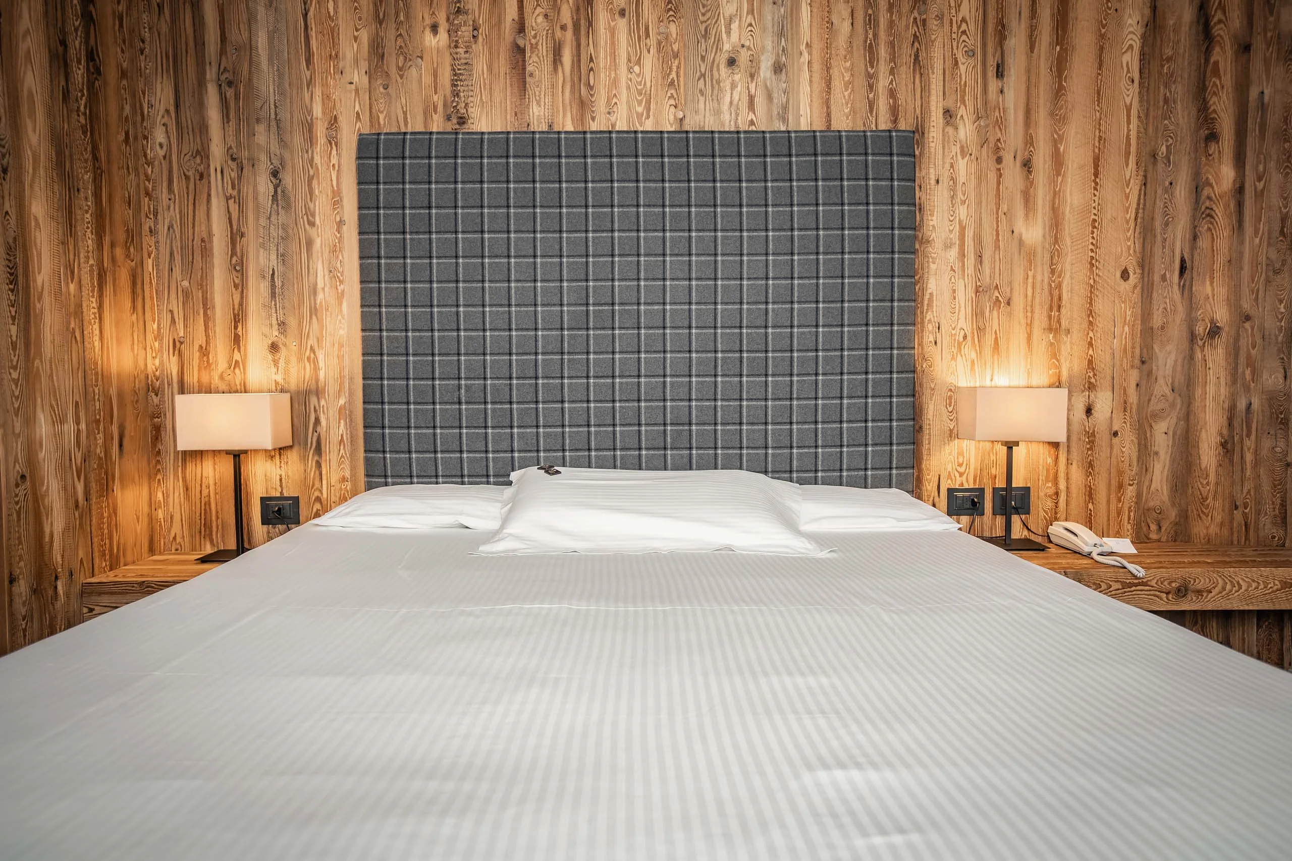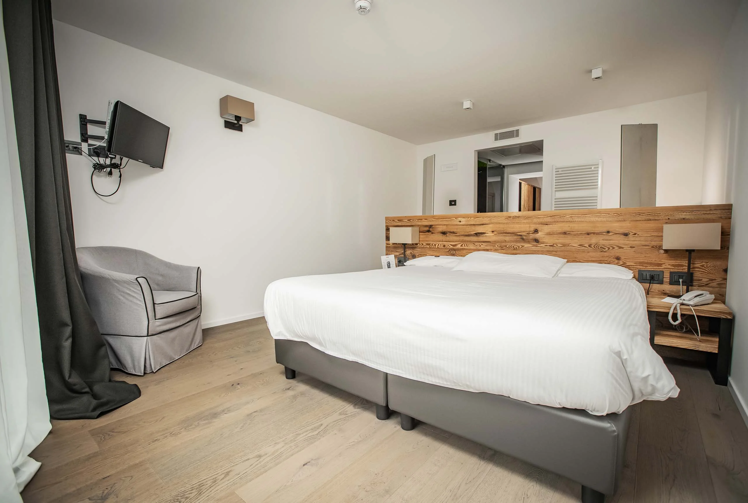 Accogliente e funzionale, questa camera di 25 m² coniuga il fascino dello stile alpino con il comfort del design moderno. Le calde finiture in legno naturale si armonizzano con linee pulite e dettagli contemporanei, creando un ambiente rilassante e curato in ogni particolare. Dotata di TV-LCD, cassaforte, minibar, macchinetta del caffè con capsule Illy/ bollitore con selezione di tè, morbido accappatoio e kit per la spa. Bagno open space con doccia a pioggia e linea cortesia firmata Comfort Zone. I toni neutri, i materiali naturali e l’illuminazione soffusa contribuiscono a un’atmosfera calda e accogliente, tipica delle architetture alpine ma con uno spirito attuale. La stanza prevede il letto matrimoniale (o due letti singoli su richiesta) una comoda poltrona letto adatta per un adulto o un bambino, all'occorrenza è possibile inserire il box o lettino da campeggio per infante 150 cm