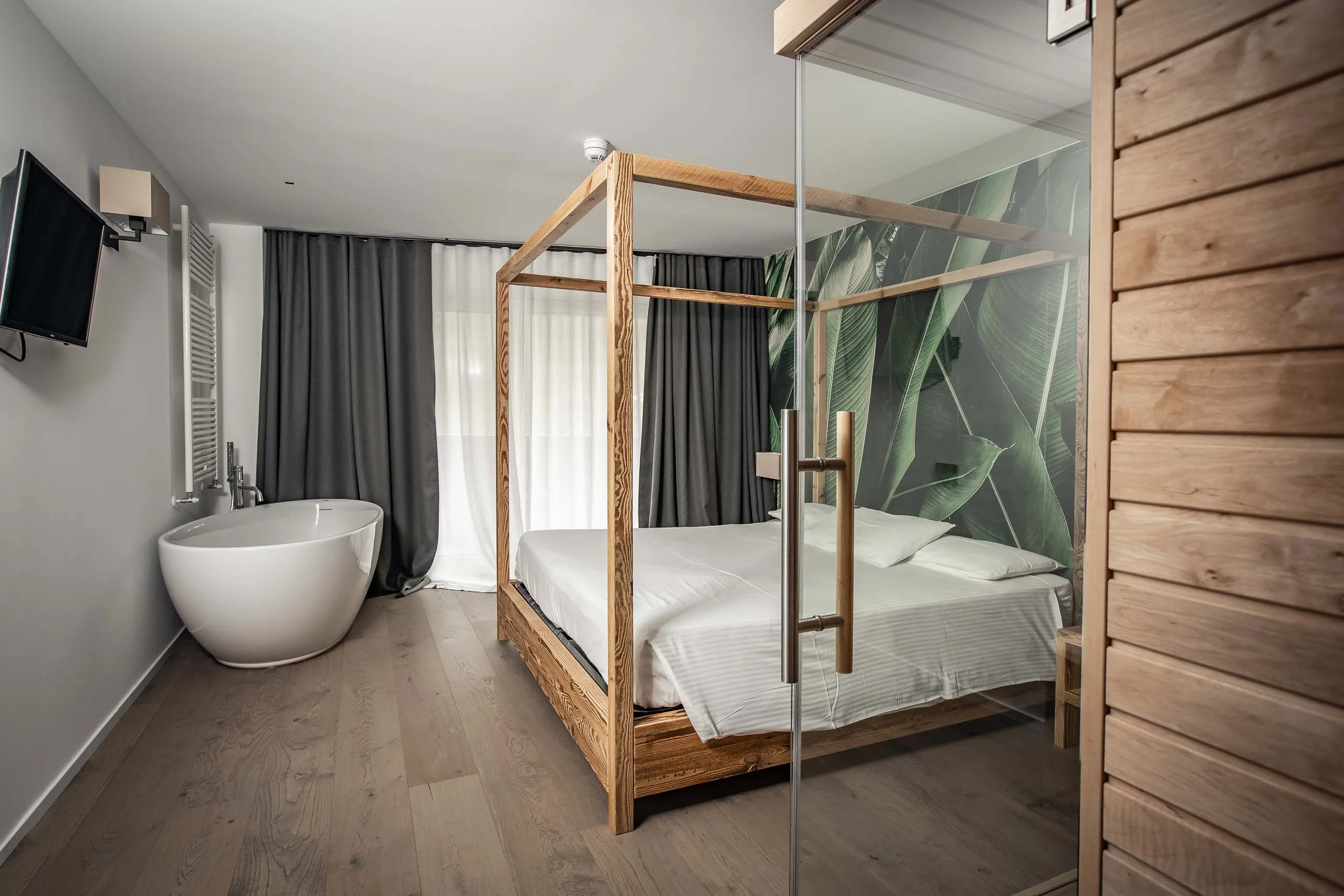 Un’oasi di relax dove il calore del legno alpino incontra l’eleganza del design moderno. Con i suoi 25 m², questa camera è perfetta per chi desidera comfort, intimità e benessere, in un’atmosfera che richiama la natura e la tranquillità della montagna. L’ambiente è curato nei minimi dettagli: pavimenti in legno, arredi artigianali in abete, tessuti naturali e luci soffuse che creano un’atmosfera accogliente e raffinata. Il vero plus? Una sauna a infrarossi privata, integrata nella stanza, per godere di momenti di puro benessere, in totale privacy. Dotata di TV-LCD, cassaforte, minibar macchinetta del caffè con capsule Illy/ bollitore con selezione di tè, morbido accappatoio e kit per la spa. Bagno open space con doccia a pioggia e linea cortesia firmata Comfort Zone. La stanza prevede il letto matrimoniale (o due letti singoli su richiesta) all'occorrenza è possibile inserire il letto singolo per adulto oppure il box o lettino da campeggio per infante 150 cm. Soluzione ideale per un soggiorno rigenerante.
